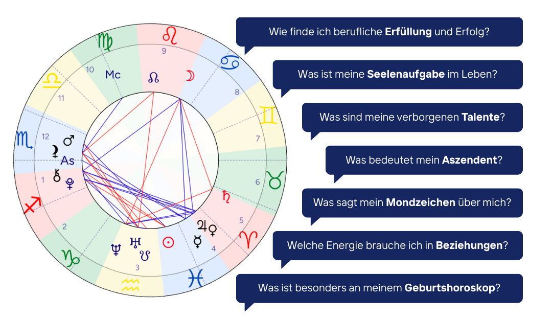 Egal, was dich gerade beschäftigt oder du schon immer über dich wissen wolltest: Schreibe deine Frage und du erhälst in wenigen Sekunden eine Antwort, die nur dein Geburtshoroskop dir geben kann.